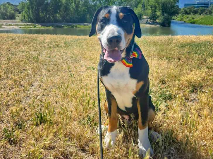 Un Bouvier d’Appenzell assis sur un terrain herbeux et qui est tenu en laisse
