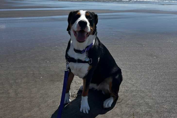 Un Bouvier d'Appenzell assis sur une surface sableuse et portant un harnais