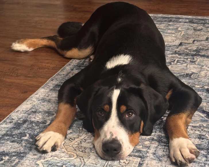 Un Bouvier d’Appenzell allongé sur un plancher