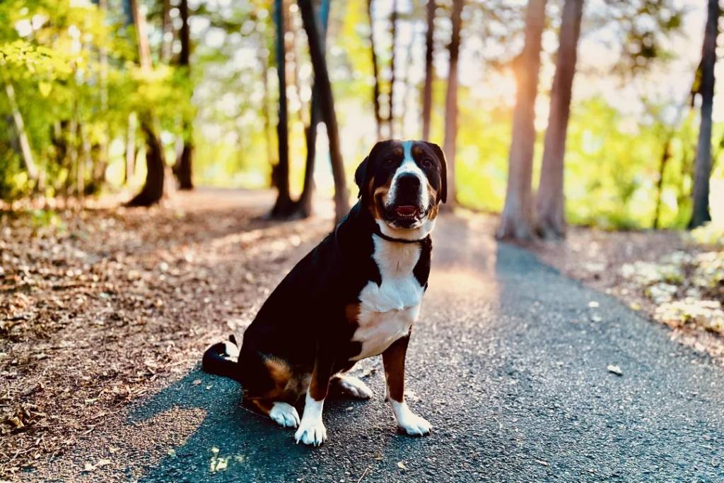 Un Bouvier d'Appenzell assis sur une allée bitumée et portant un collier autour du cou