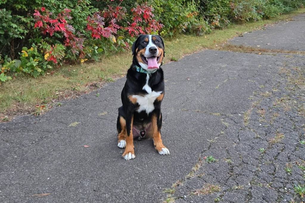 Un Bouvier d'Appenzell assis sur une surface bitumée et portant un collier autour du cou