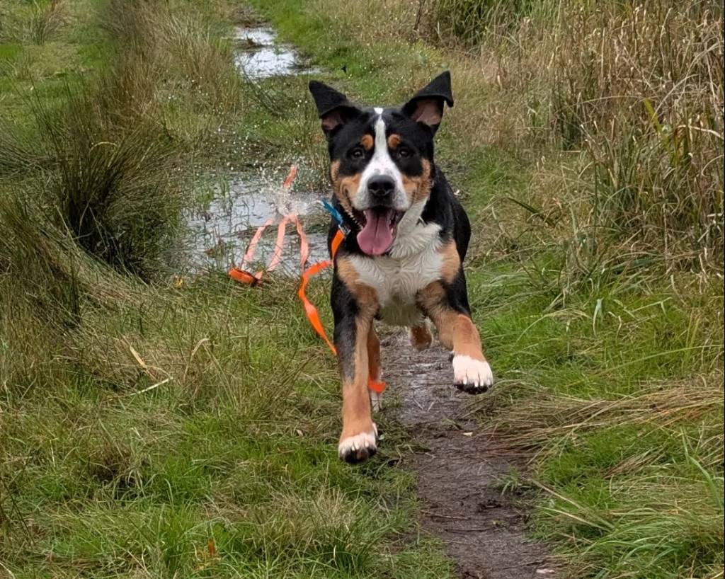 Un Bouvier d’Appenzell courant sur un terrain herbeux et qui est tenu en laisse
