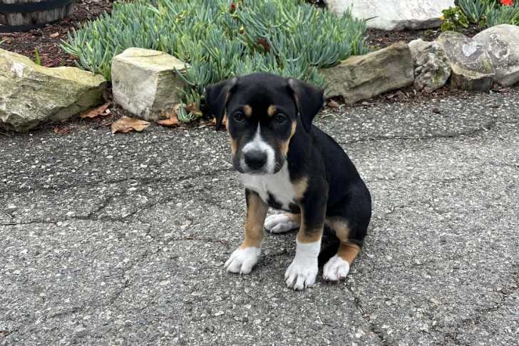Un chiot Bouvier d'Appenzell assis sur une surface bitumée