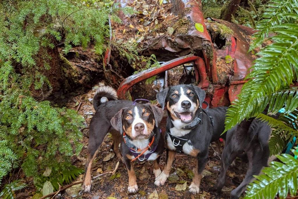 Deux Bouvier d'Appenzell dans une forêt et portant tous deux un harnais