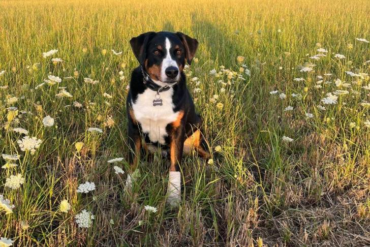 Un Bouvier d'Appenzell assis sur un terrain herbeux et portant un collier autour du cou