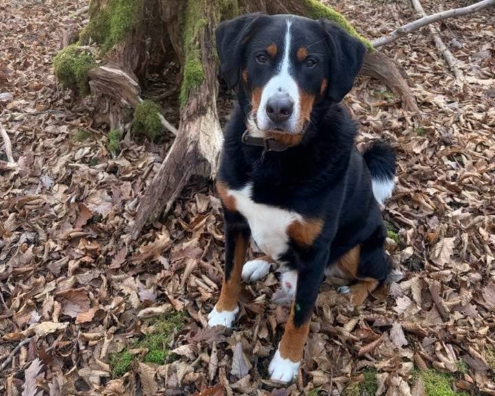 Un Bouvier d’Appenzell assis sur un sol jonché de feuilles mortes et portant un collier autour du cou