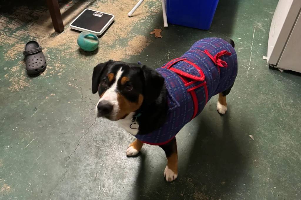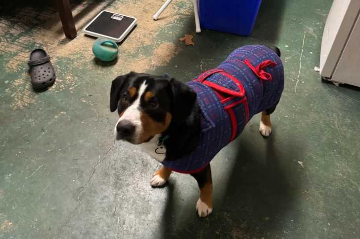 Un Bouvier de l'Entlebuch sur une surface bétonnée et portant un habit pour chien