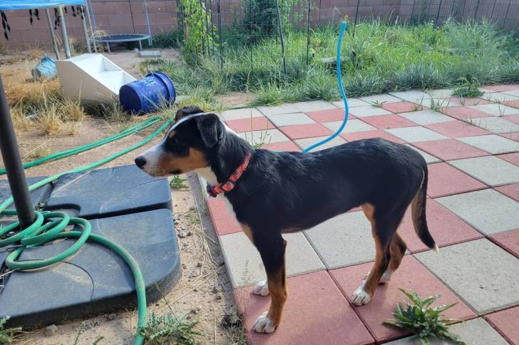 Un Bouvier de l'Entlebuch sur un sol pavé et portant un collier autour du cou