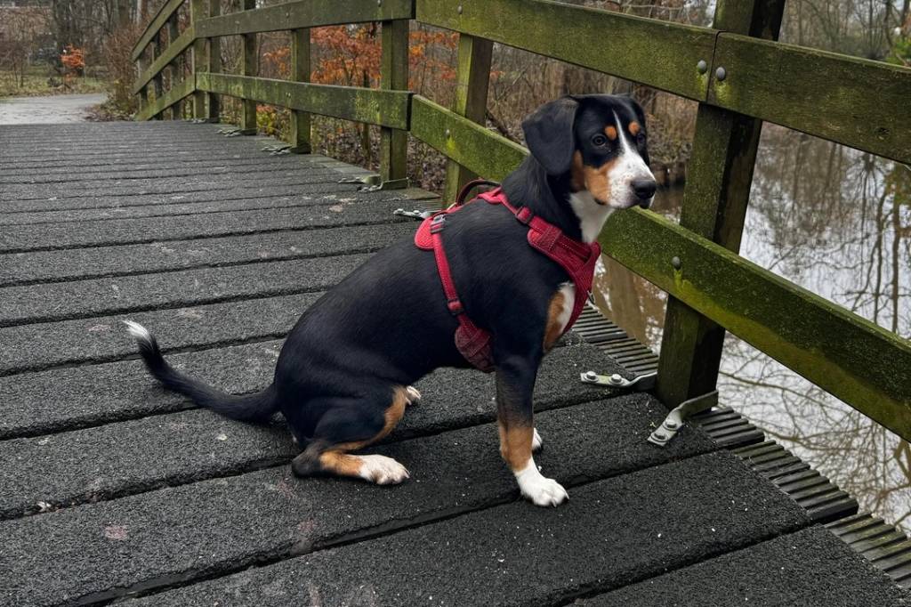 Un Bouvier de l'Entlebuch assis sur un pont en bois et portant un harnais