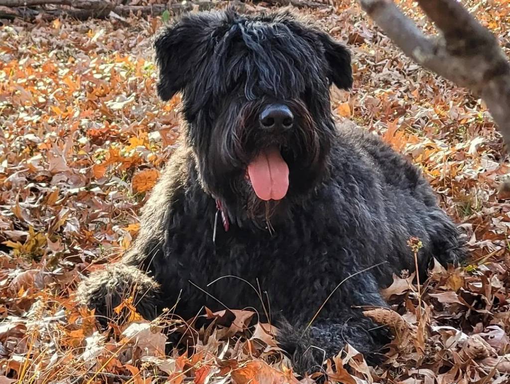 Un Bouvier des Flandres ayant la langue et portant un collier autour du cou