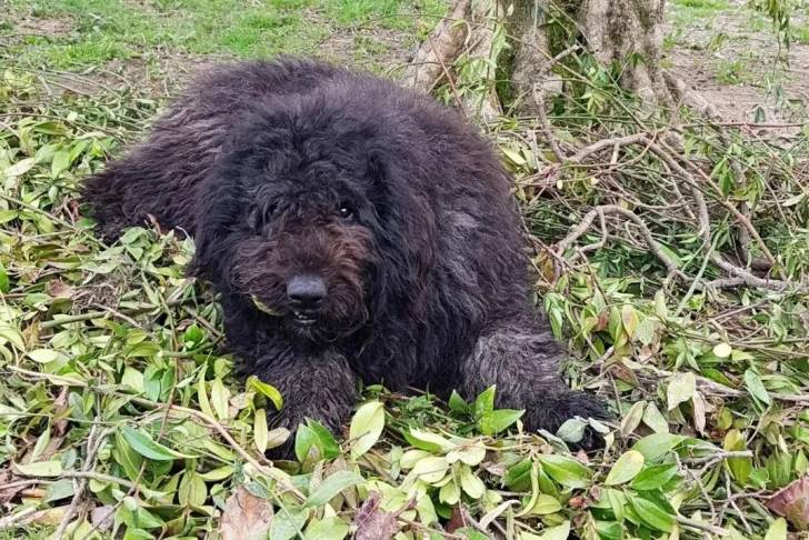 Un Bouvier des Flandres allongé sur un sol jonchés de feuilles mortes