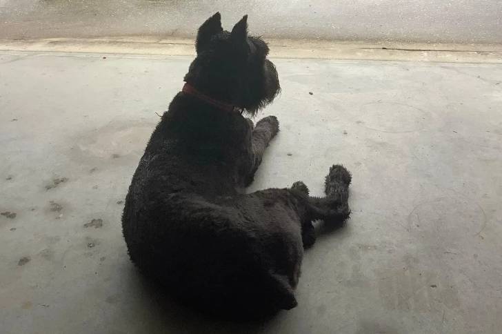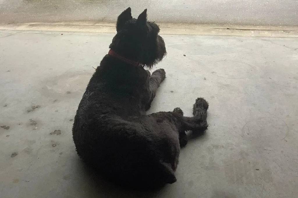 Un Bouvier des Flandres allongé sur une surface bétonnée et portant un collier autour du cou