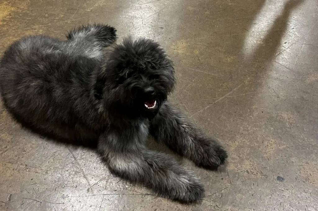 Un Bouvier des Flandres allongé sur une surface bétonnée et ayant la gueule ouverte