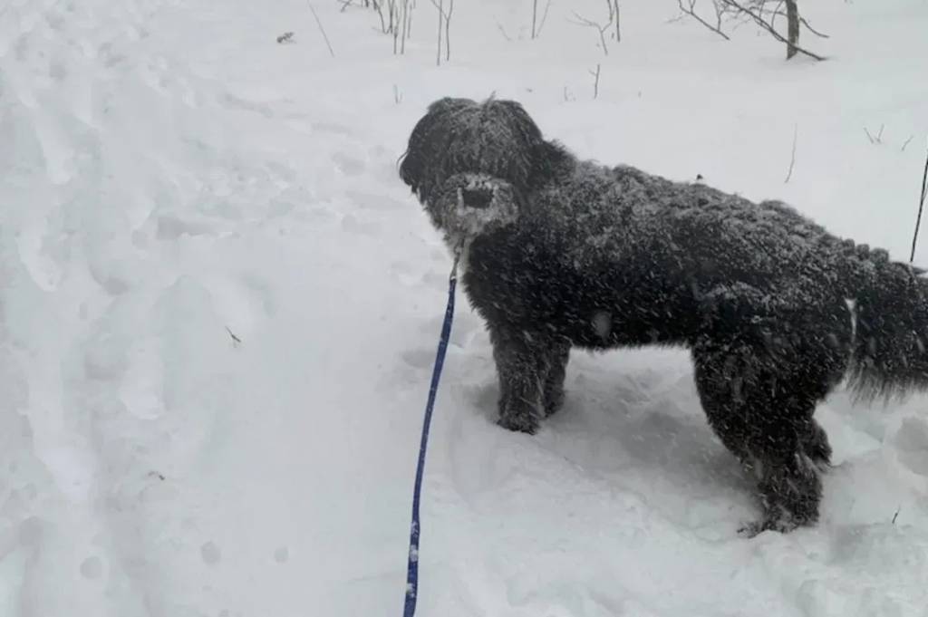 Un Bouvier des Flandres sur une surface enneigée et qui est tenu en laisse