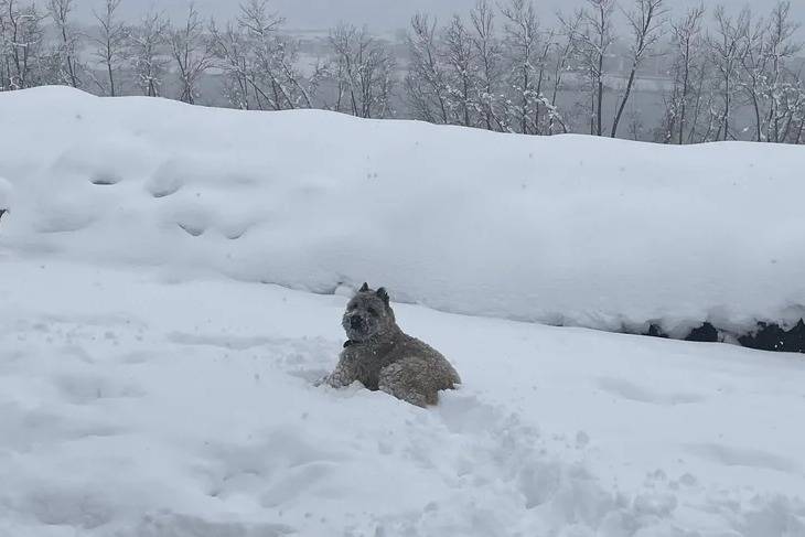 Un Bouvier des Flandres allongé sur une surface enneigée et portant un collier autour du cou