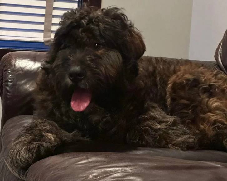 Un Bouvier des Flandres allongé sur un canapé et tirant la langue