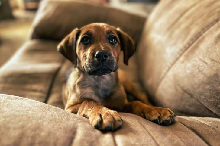 Un chiot Boxador au pelage fauve, allongé sur un canapé en cuir