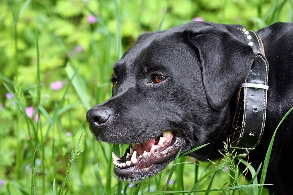 Un Boxador au pelage noir, portant un collier en cuir noir, dans un champ
