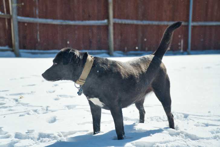 Un Boxador au pelage chocolat, se tenant debout dans la neige