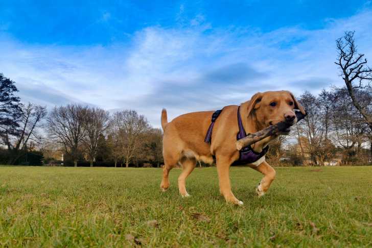 Un Boxador au pelage fauve dans une forêt, tenant un bâton dans sa gueule