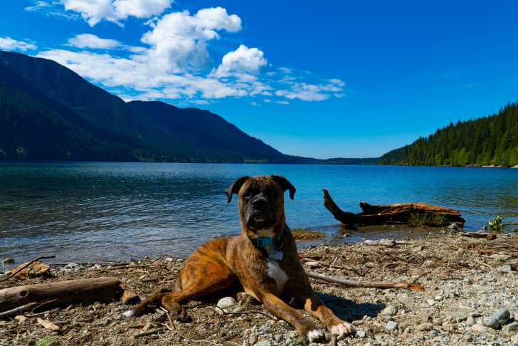 Un Boxer Shepherd à la robe bringée, allongé au bord d'un lac