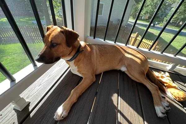 Un chien Boxer Shepherd extériorise sa joie de vivre