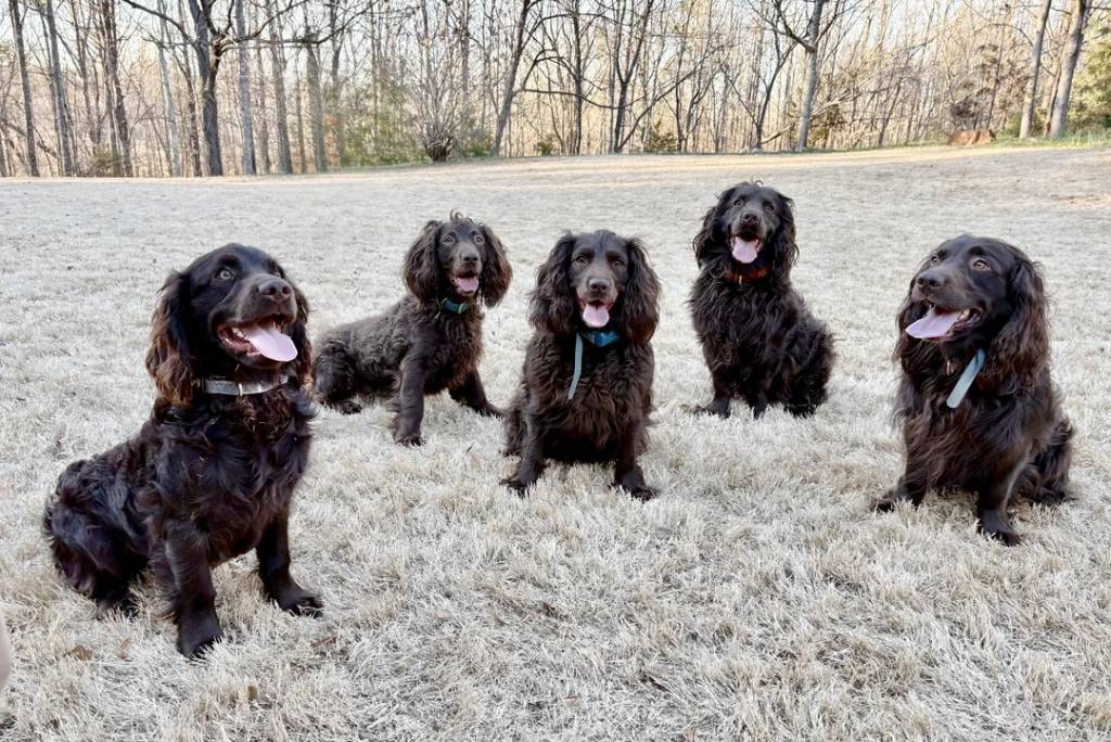 Cinq Boykin Spaniels assis sur l’herbe, la langue pendante.