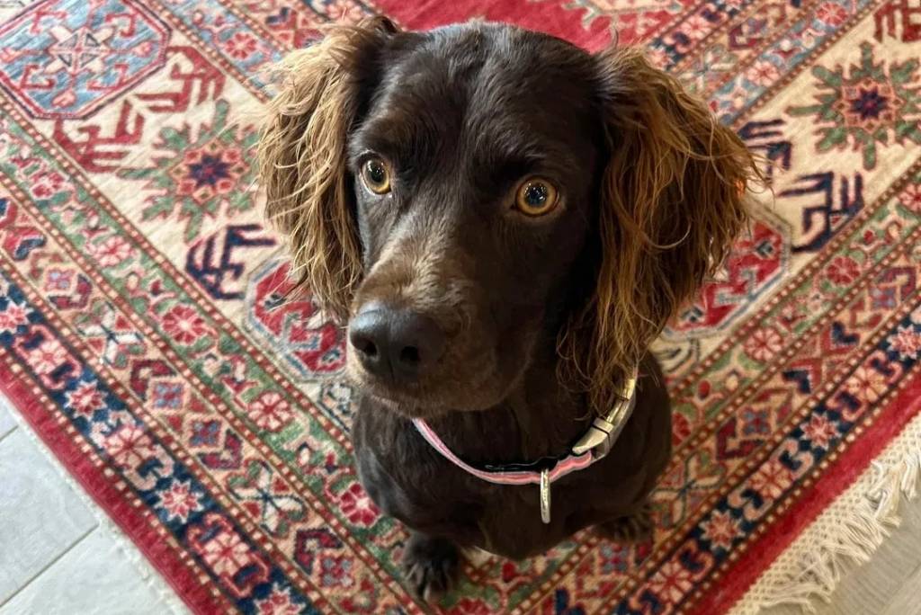 Un Boykin Spaniel assis sur un tapis et portant un collier autour du cou