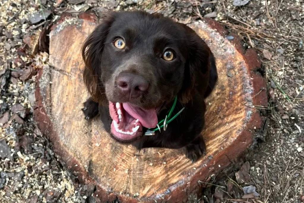 Un Boykin Spaniel assis sur un tronc d'arbre et portant un collier autour du cou