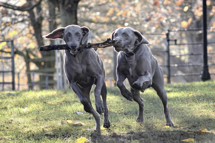 Deux Braques de Weimar jouent avec un gros bâton dans un parc