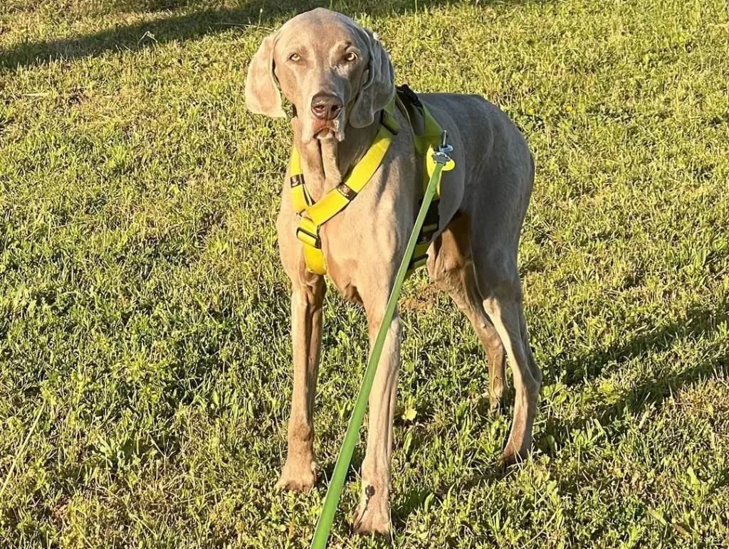 Un Braque de Weimar sur une surface herbacée et qui est tenu en laisse