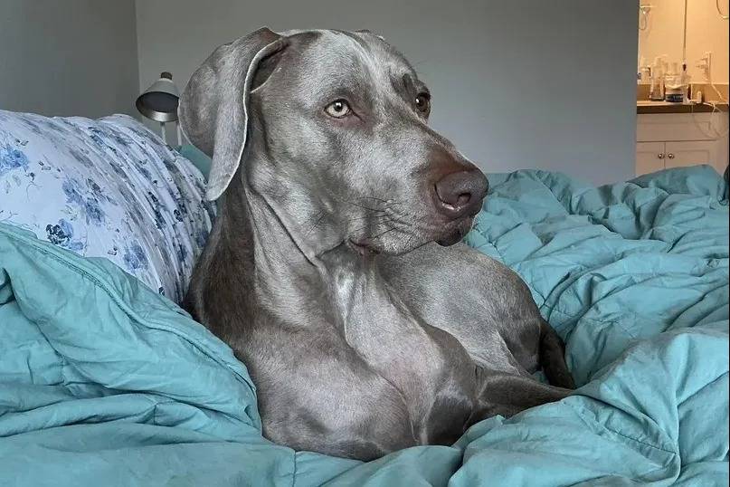 Un Braque de Weimar allongé sur un lit et semblant détendu