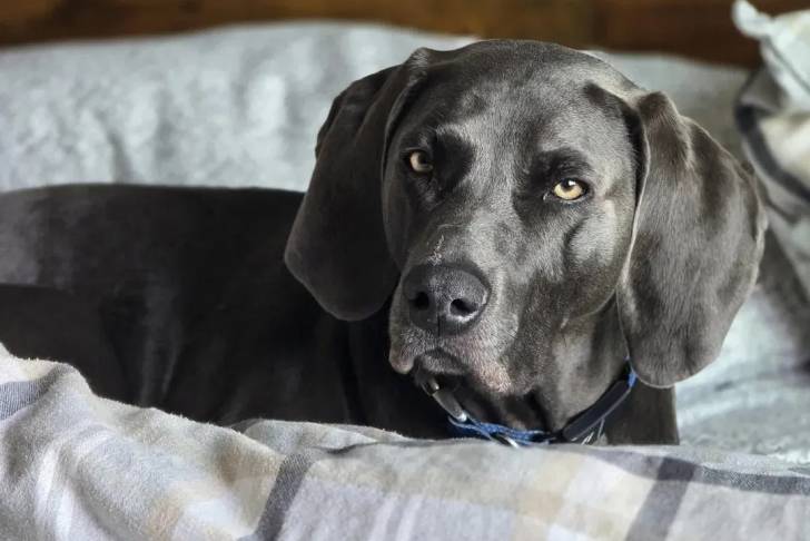 Un Braque de Weimar regardant vers la caméra et portant un collier autour du cou