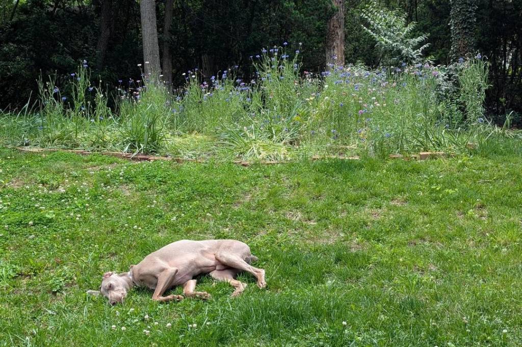 Un Braque de Weimar allongé sur un terrain herbeux et portant un collier autour du cou