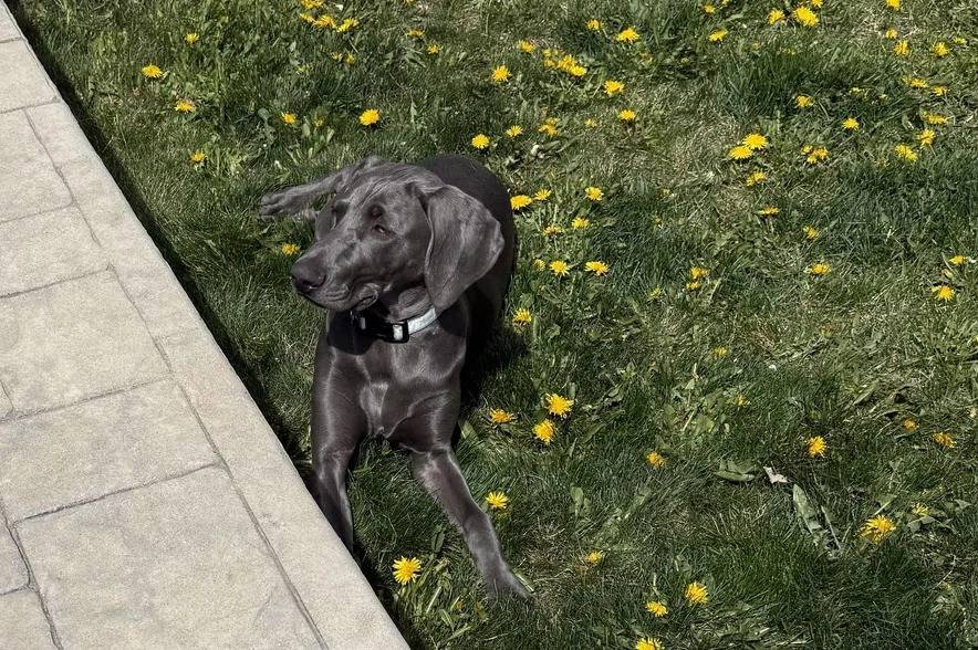 Un Braque de Weimar allongé sur une surface herbacée et portant un collier autour du cou