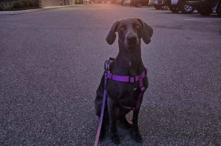 Un Braque de Weimar sur une surface bitumée et qui est tenu en laisse