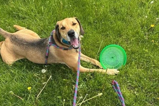 Un Braque de Weimar allongé sur un terrain herbeux et qui est tenu en laisse