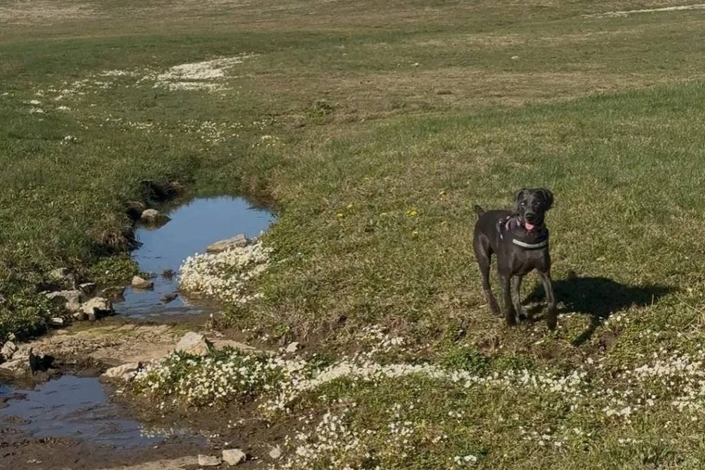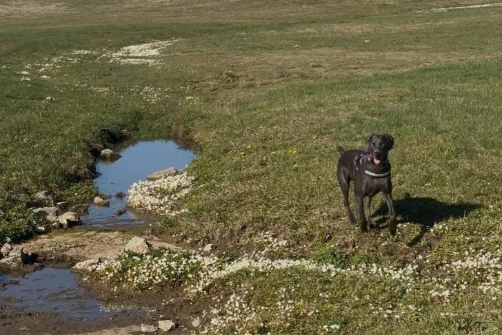 Un Braque de Weimar sur une surface herbacée et portant un harnais