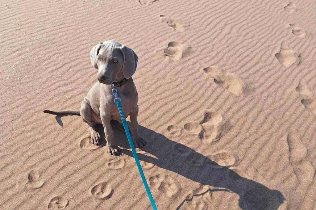 Un Braque de Weimar assis sur une surface sableuse et qui est tenu en laisse