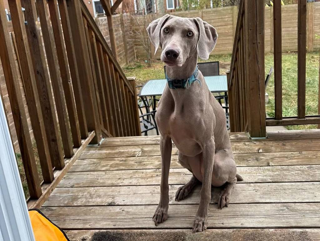 Un Braque de Weimar assis sur un plancher et portant un collier autour du cou