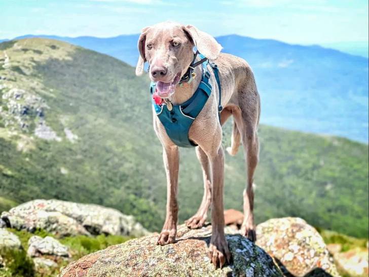 Un Braque de Weimar sur un rocher et portant un harnais