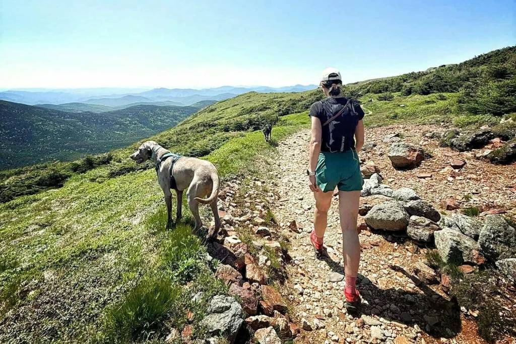 Un Braque de Weimar en randonnée avec sa maîtresse et portant un harnais