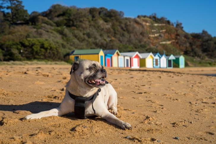 Un Bugg portant un harnais est allongé sur  le sable, sa tête orientée vers la droite