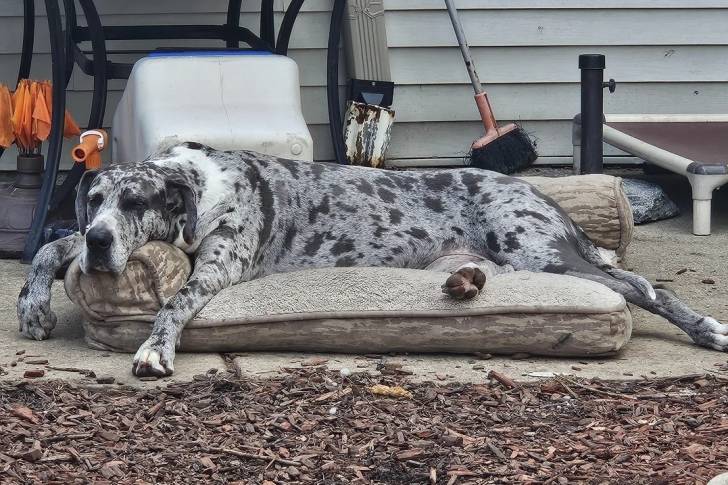 Un Bull Daniff allongé sur un lit pour chien et semblant détendu