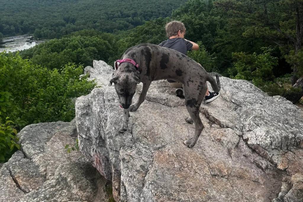 Un Bull Daniff sur le bord d'une falaise et portant un collier autour du cou