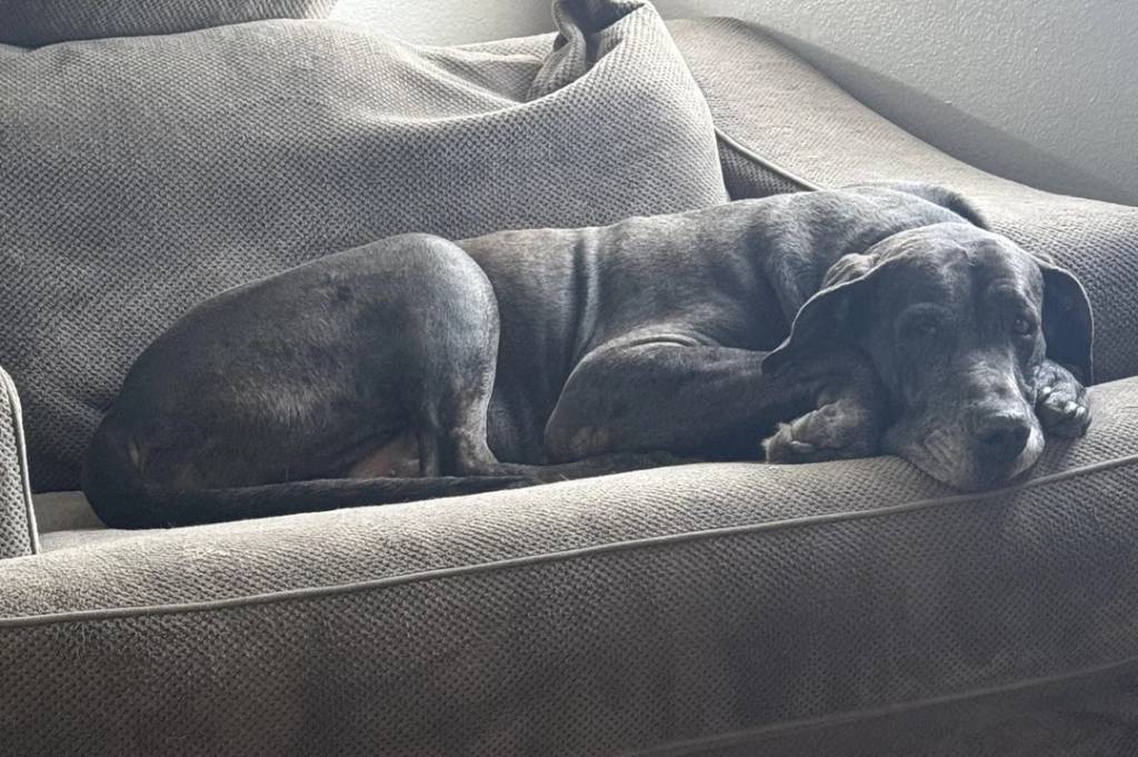 Un Bull Daniff allongé sur un canapé et regardant vers la caméra