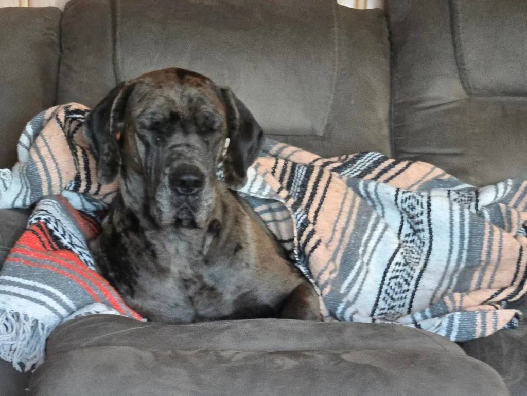 Un Bull Daniff allongé sur un canapé et semblant détendu