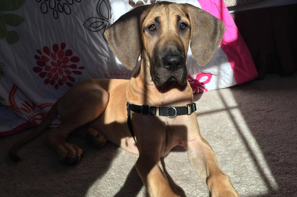 Un Bull Daniff allongé sur une moquette et portant un harnais