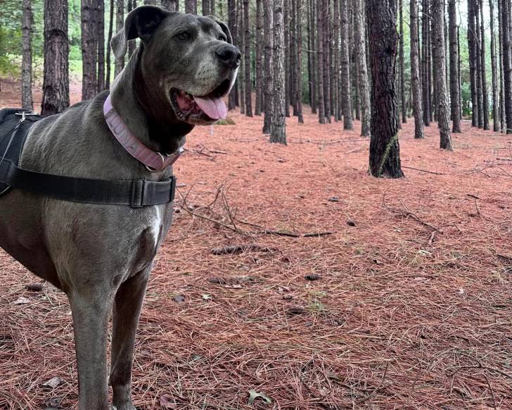 Un Bull Daniff sur un terrain herbeux et portant un harnais