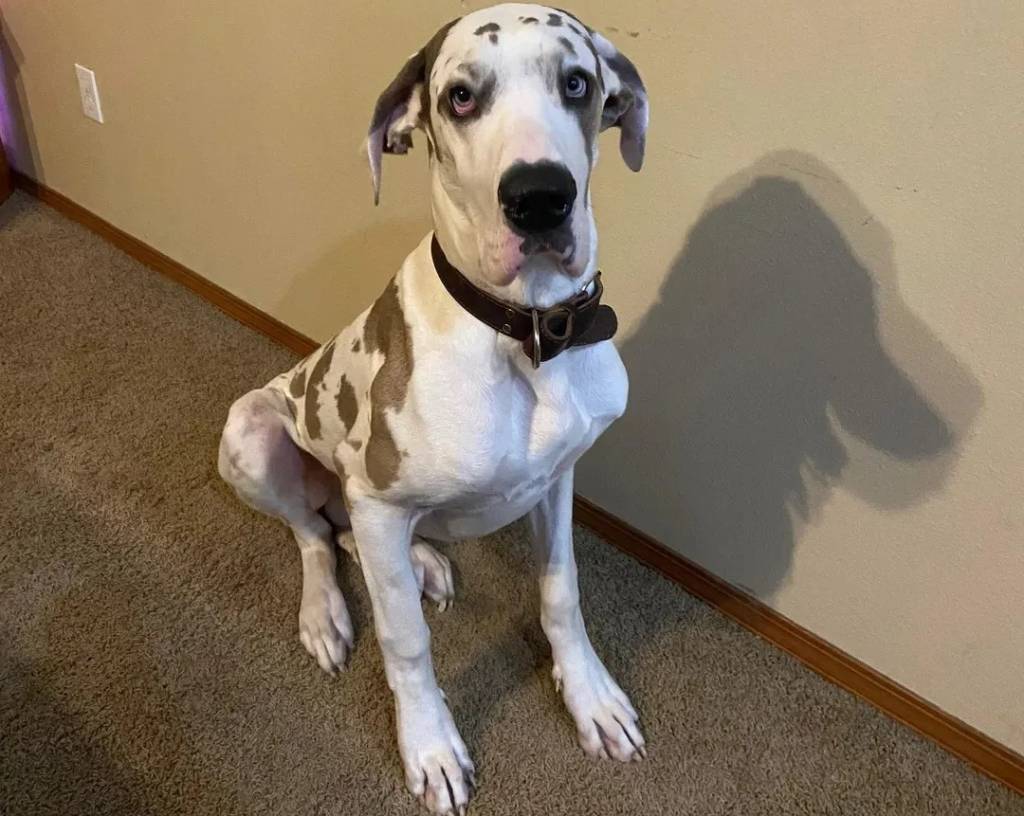 Un Bull Daniff assis sur une moquette et portant un collier autour du cou
